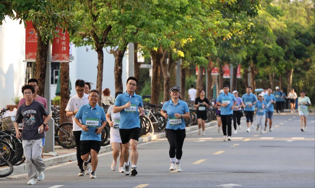 活动开幕式在海阳馆门前举行,校区党委副书记、阳江校区工会主席丁永成出席并致辞。他在讲话中回顾了学校90年来深耕海洋科教、服务国家海洋战略的发展历程,指出本次团队跑活动不仅是校庆系列活动的重要组成部分,更是“致敬校史、凝聚情感、传承精神”的重要载体。丁永成还特别叮嘱全体参赛师生,在享受运动乐趣、传递校庆喜悦的同时,要始终将安全放在首位,相互扶持、协作同行,展现海大师生良好精神风貌。随着丁永成鸣枪发令,3支队伍依次出发,沿着预设路线有序奔跑,途中,师生们相互鼓劲、彼此加油。